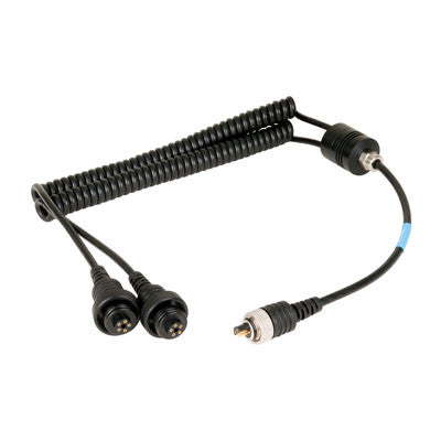 Y-shaped sync cord with an Ikelite-style plug on the housing end and SEA&SEA / INON-style plugs on the strobe ends. The Ikelite-style plug is widely recognized as the most reliable waterproof strobe sync connection available. Built-in strain reliefs reduce stress on cord ends.